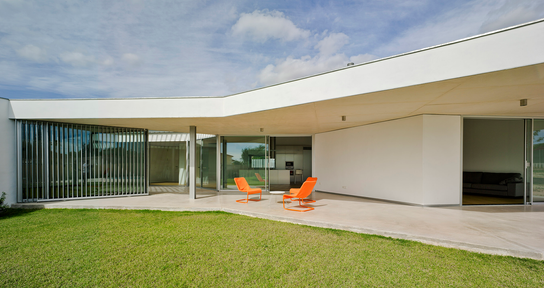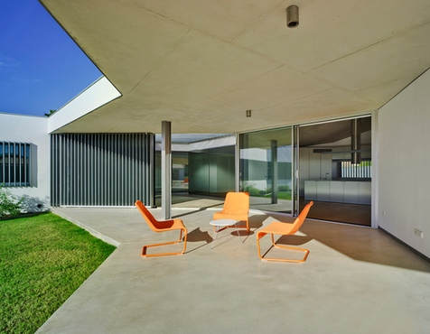 Esta casa es un híbrido de varios tipos de casas. Ante todo, lo primero que quiere es ser una "casa del Camp d´Elx", como las que todavía pueblan las pedanías rurales con su peculiar silueta y cuya arquitectura tradicional hace uso de las cubiertas inclinadas de cerámica y de los profundos porches -para sombra- orientados al mediodía. Pero, a la vez, también quiere ser una "casa-patio mediterránea", introvertida, protegida del exterior y puramente blanca. Y, además, también tiene en su genética a una "casa californiana", a una de esas sofisticadas casas de la admirada arquitectura moderna de Los Ángeles -con quien compartimos clima mediterráneo- que despliegan sus plantas, muchas en forma de L, en abiertos espacios horizontales que se proyectan hacia los jardines y las refrescantes piscinas.