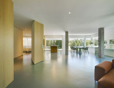 Ambas ideas se formalizan con un juego de muros curvos que en el caso del gran espacio común zonifican sus diversas funcionalidades y, en el caso del vestíbulo, dirigen suave y dinámicamente hacia los dormitorios ubicados en los extremos o hacia ese espacio principal de la casa en el centro. Por último, el dormitorio de matrimonio también se ha concebido como un único espacio cuya pieza protagonista es una ducha central de vidrio curvo.